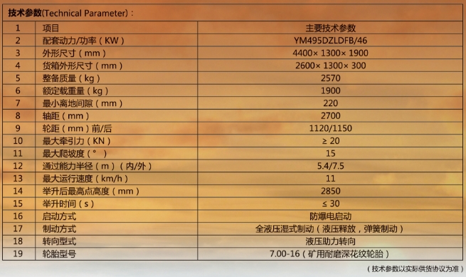 WC1.9J(B)防爆柴油機(jī)無軌膠輪機(jī)車,配套本公司生產(chǎn)的YM495DZLDFB防爆柴油機(jī)為動力、機(jī)械傳動、液壓助力轉(zhuǎn)向、全液壓濕式制動,適用煤礦井下運(yùn)輸作業(yè)。機(jī)車具有雙向行駛功能,配套實芯輪胎,結(jié)構(gòu)緊湊、外開小、牽引力大、爬坡能力強(qiáng)、操作方便等優(yōu)點,可作為井下順槽車使用。